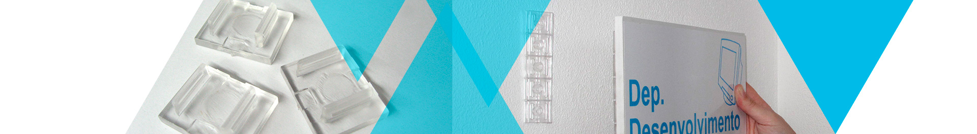 Conector em acrílico transparente, para colagem ao painel/grafismo e posterior encaixe no perfil receptor, para fixação de painéis/grafismos à parede.