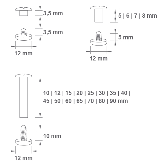 Parafuso plástico branco para construção de catálogo/paleta de cores ou padrões. Botão de rosca para catalogação de amostras. Vários tamanhos, permitindo variações de espessura do catálogo. O produto consiste em duas peças, a rosca e o suporte.
