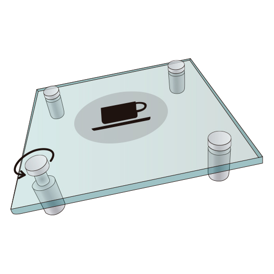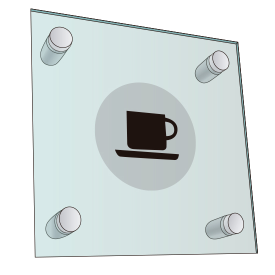 Fixador de painel/grafismo à parede, plástico transparente, composto por duas peças, uma base com rosca interior e um buraco através do qual passa o parafuso de fixação à parede, e um topo (face plana) com rosca exterior, o qual enrosca na base e aperta o painel/grafismo contra a parede, ficando uma pequena distância entre este e a parede, dando um design de relevo. Disponível em várias medidas.