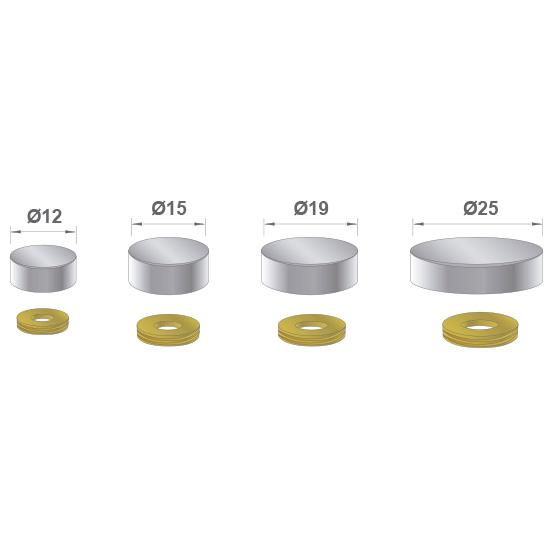 Fixador de painel/grafismo à parede, metálico (bronze) em forma de cápsula, composto por duas peças, uma anilha que fica fixa à parede através do sistema convencional (bucha + parafuso) e outra que enrosca nesta anilha e aperta o painel/grafismo contra a parede. Disponível em vários diâmetros.