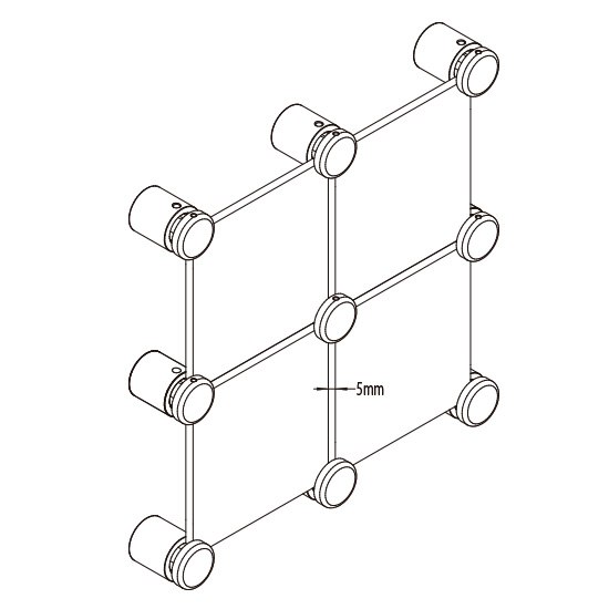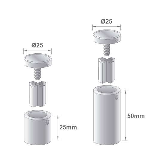 Fixador/distanciador lateral multi painel, em alumínio, de topo plano com quatro vias e montagem simples, pois não carece de cortes ou perfurações no painel/grafismo. Permite a montagem de vários painéis/grafismos. Disponível em vários tamanhos.