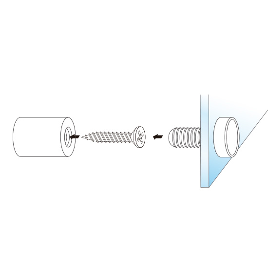 Fixador de painel/grafismo à parede, metálico (alumínio), composto por duas peças, uma base com rosca interior e um buraco através do qual passa o parafuso de fixação à parede, e um topo (face plana) com rosca exterior, o qual enrosca na base e aperta o painel/grafismo contra a parede, ficando uma pequena distância entre este e a parede, dando um design de relevo. Disponível em várias medidas.