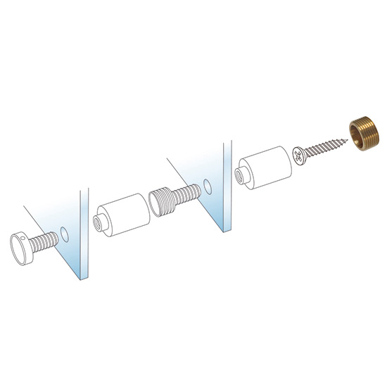 Conector/Base do Fixador/Distanciador Roscado Multicamada - Fixador de painel/grafismo à parede, metálico (alumínio), idêntico aos distanciadores tradicionais, contudo este sistema permite construir grafismos com base em várias camadas (níveis), tendo para o efeito uma peça (espaçador), que permite suportar-se num painel e fixar noutro.