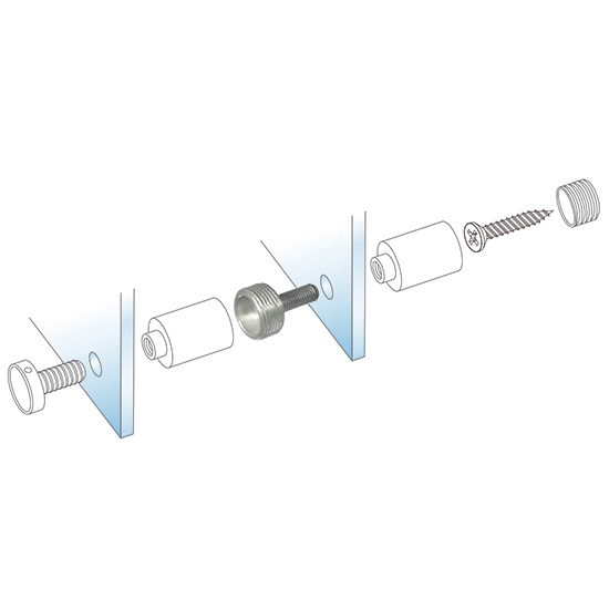 Conector/Afastador do Fixador/Distanciador Roscado Multicamada - Fixador de painel/grafismo à parede, metálico (alumínio), idêntico aos distanciadores tradicionais, contudo este sistema permite construir grafismos com base em várias camadas (níveis), tendo para o efeito uma peça (espaçador), que permite suportar-se num painel e fixar noutro.
