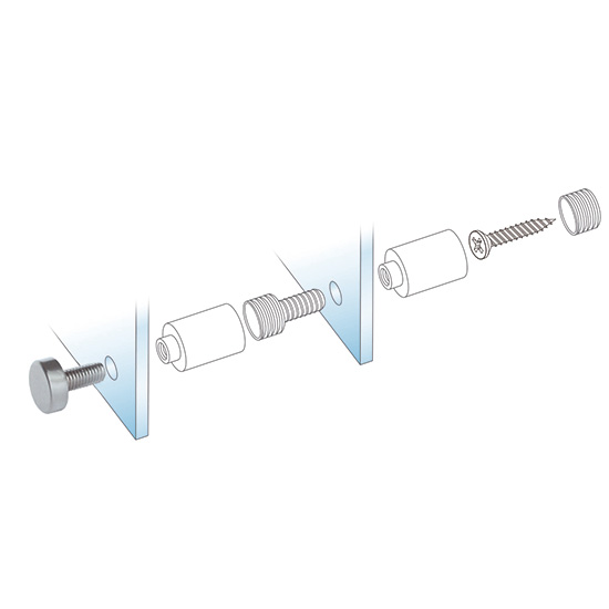 Topo Plano do Fixador/Distanciador Roscado Multicamada - Fixador de painel/grafismo à parede, metálico (alumínio), idêntico aos distanciadores tradicionais, contudo este sistema permite construir grafismos com base em várias camadas (níveis), tendo para o efeito uma peça (espaçador), que permite suportar-se num painel e fixar noutro. Disponível em várias medidas.