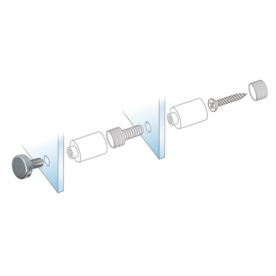 Topo Plano do Fixador/Distanciador Roscado Multicamada - Fixador de painel/grafismo à parede, metálico (alumínio), idêntico aos distanciadores tradicionais, contudo este sistema permite construir grafismos com base em várias camadas (níveis), tendo para o efeito uma peça (espaçador), que permite suportar-se num painel e fixar noutro. Disponível em várias medidas.