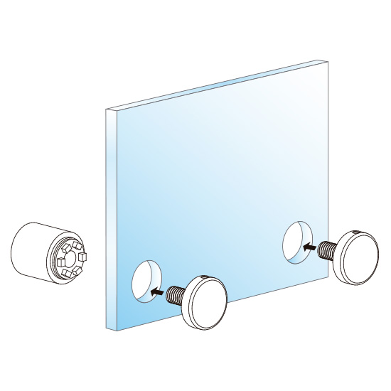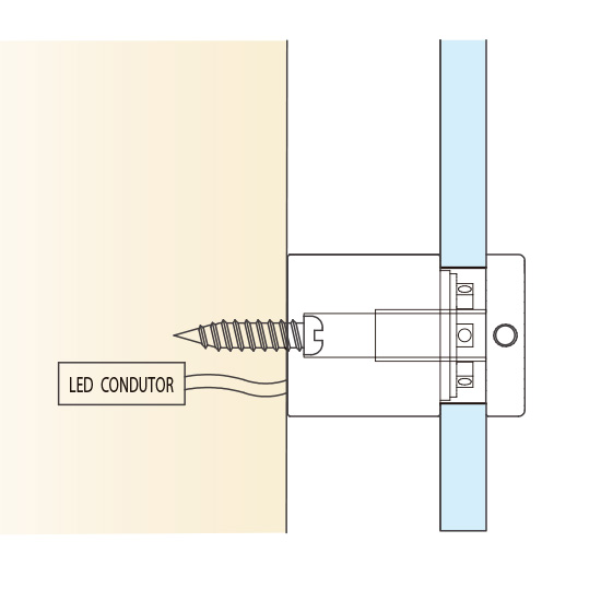 Fixador de painel/grafismo à parede, metálico (aço) com iluminação interior em LED, composto por duas peças, uma base com rosca interior e um buraco através do qual passa o parafuso de fixação à parede, e um topo (face plana) com rosca exterior, o qual enrosca na base e aperta o painel/grafismo contra a parede, ficando uma pequena distância entre este e a parede, dando um design de relevo. Disponível em várias cores de LED.