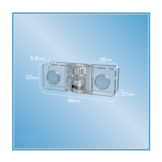 Ligador em acrílico transparente para a ligação de painéis entre si. O ângulo de ligação pode ser fixo e permite uma amplitude até 90° entre painéis. Várias medidas para as diferentes espessuras dos painéis dos grafismos. De montagem bastante simples e extremamente elegante.